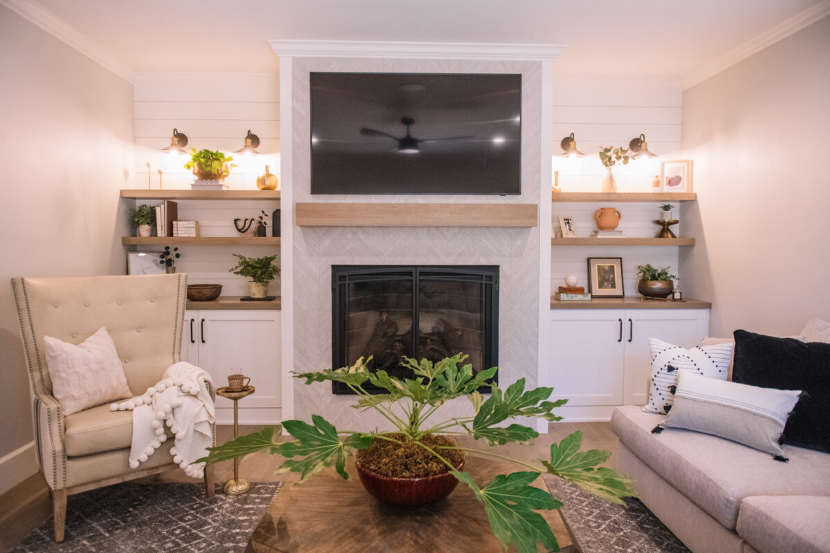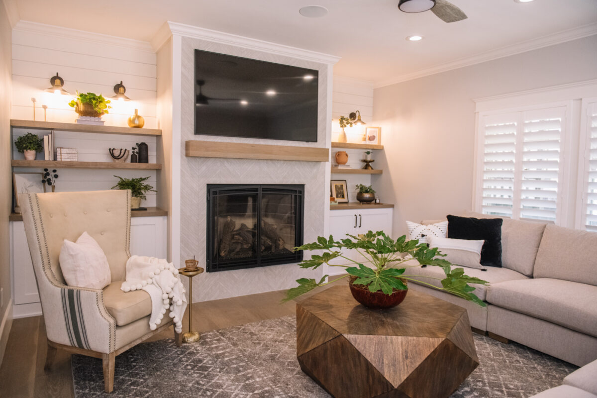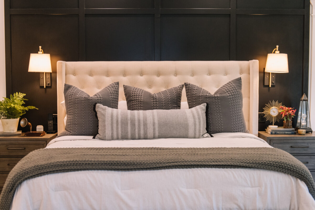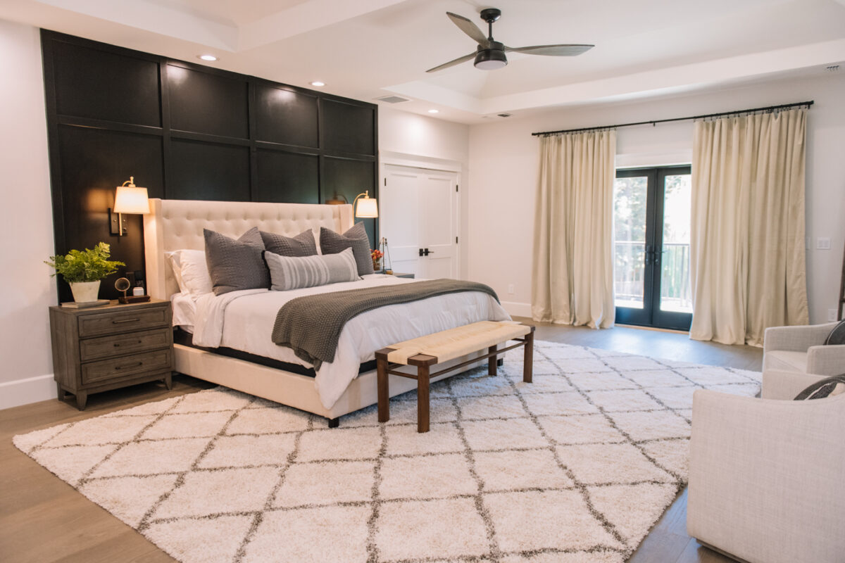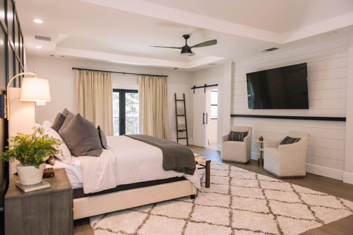 Open floor plan in the modern farmhouse design make for a spacious primary bedroom
